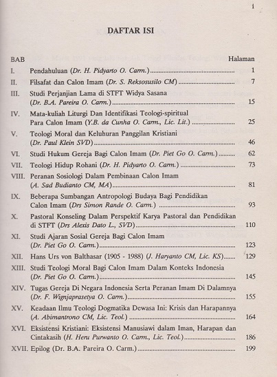 Buku yang berjudul Seputar Pendidikan Calon Imam di STFT Widya Sasana ini pertama-tama bertujuan memperkenalkan pendidikan para calon imam kepada umat. Buku ini dibagi menjadi dua bagian: bagian pertama memuat tulisan-tulisan yang lebih bersifat memperkenalkan beberapa mata kuliah yang diajarkan di STFT Widya Sasana, sedangkan bagian kedua memuat artikel-artikel yang mengajak para pembaca untuk merefleksikan salah satu aspek pendidikan para (calon) imam atau salah satu aspek ilmu yang dipelajari di STFT.
